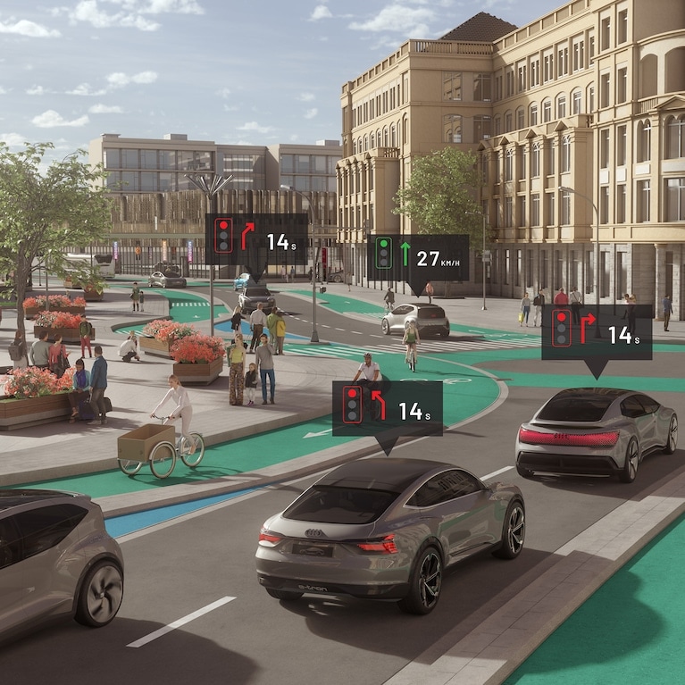 Audi relies on varied systems like radar, camera, and lidar. Driving situations can be accessed with great accuracy leading to automated warning, braking, and avoidance functions that adapt to each situation. Audi also uses V2X (vehicle to everything) technology, which is connected car-to-car driving as well as car-to-environment communication, that includes other road users, like pedestrians and cyclists.